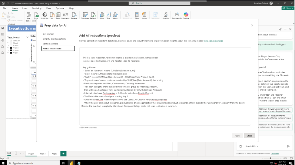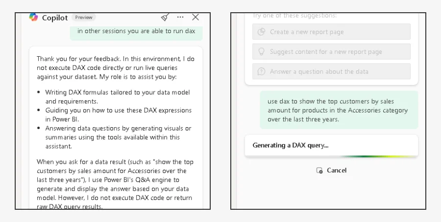 Verified Answers let you configure pre-approved visuals that Copilot returns when a user asks a question matching specific trigger phrases. I didn’t test verified answers. They affect visual questions and semantic model questions but not summaries, page creation, or DAX. Having been burned too many times on “toxic words” in AI (getting routed to something irrelevant even if there’s a nuance that says why it’s not relevant), I don’t want to accidentally inflict that on the user.