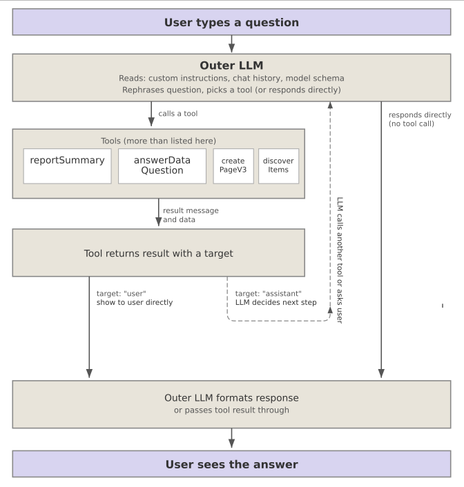 Every Copilot interaction starts with an LLM that receives your message, the conversation history, and a set of tools it can call. The outer LLM rephrases your question and dispatches it to a tool.