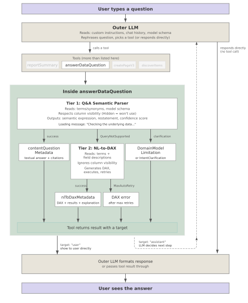 The Desktop and Service agents share the same backend query pipeline (answerDataQuestion) but differ in tool availability, the outer LLM’s system prompt behavior around DAX, and how citations are presented. Microsoft’s recommended implementation order for data preparation is: AI data schemas, then verified answers, then AI instructions, then descriptions.